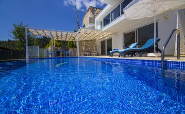 Antalya, Kaş, Üzümlü bölgesinde yer alan Villa Eslem Üzümlü, korunaklı havuz alanına sahip, 2 yatak odalı ve 5 kişi konaklama kapasiteli özel bir tatil villasıdır.