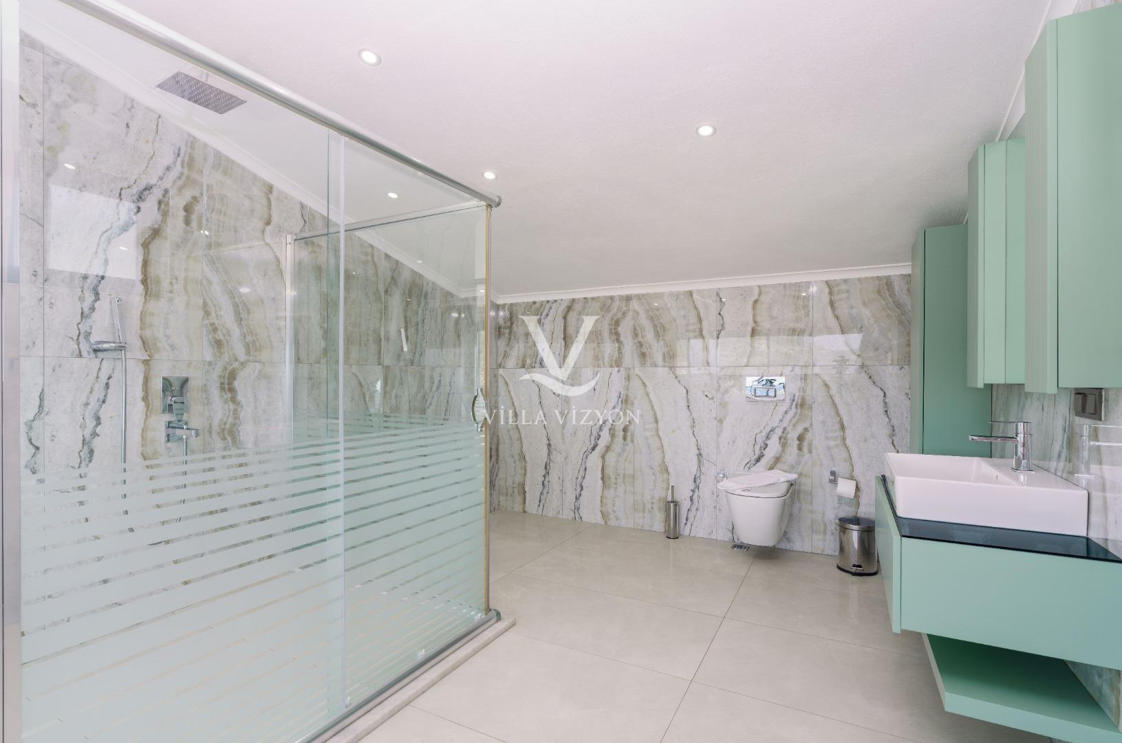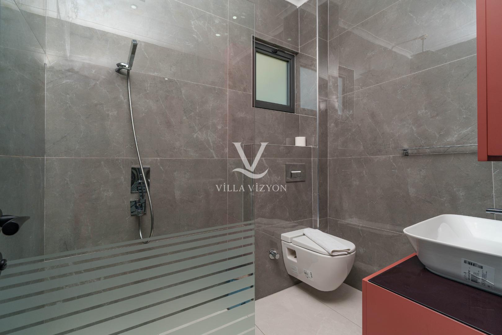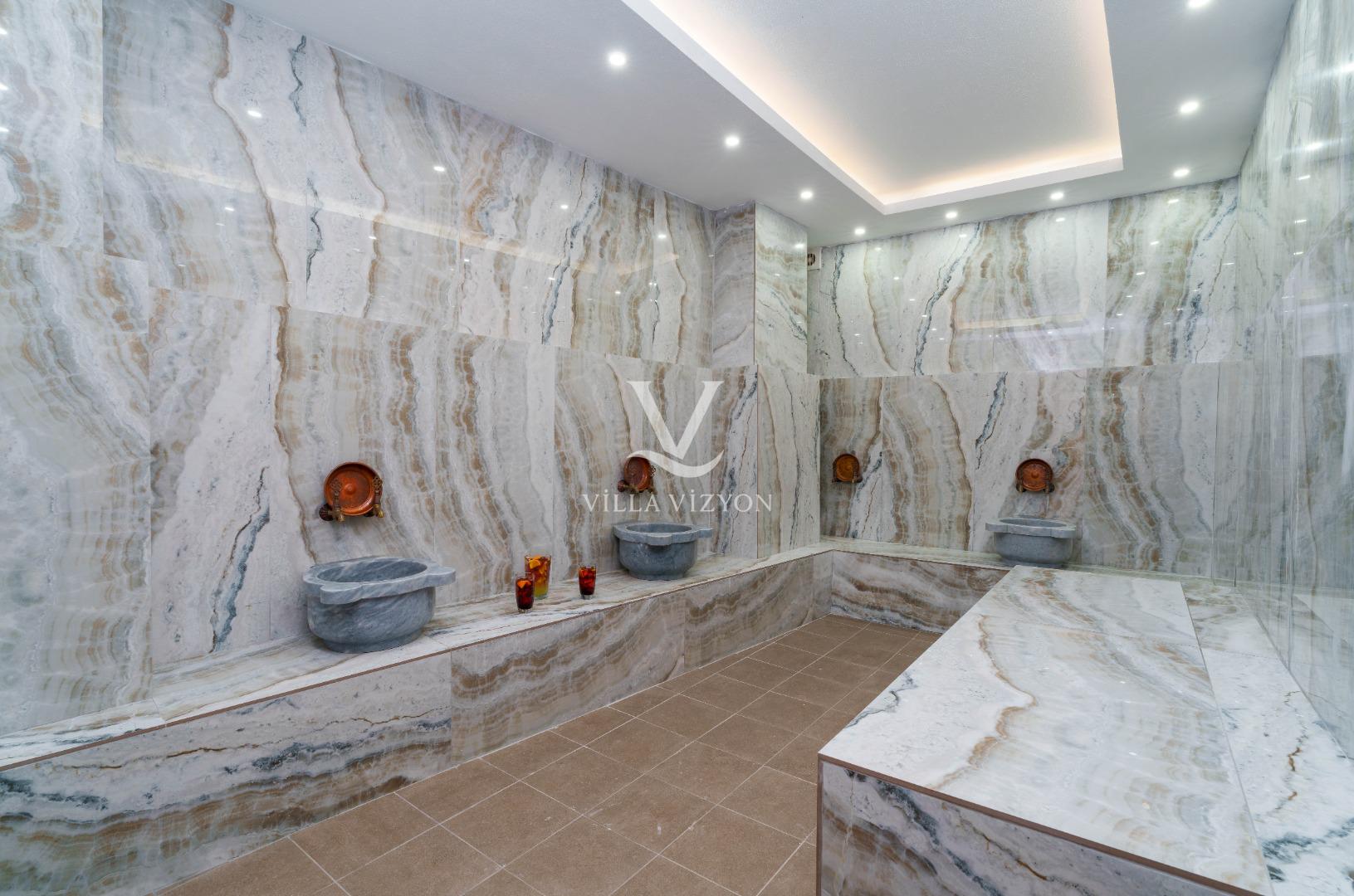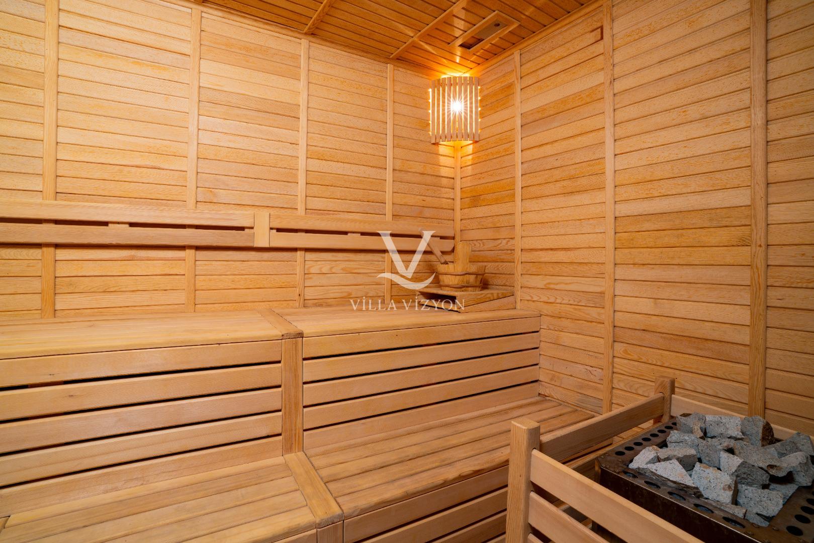 Villamızın teras katında yer alan jakuzili yatak odası, aynı zamanda özel sauna ve Türk hamamı ile donatılmış olup, size hem konfor hem de dinlenme imkânı sunar. Geniş terasta bulunan deniz manzaralı oturma alanı, gün batımında keyifli vakitler geçirmek isteyen misafirlerimiz için idealdir. Bu lüks tatil villası, hem geniş aileler, hem de kalabalık arkadaş grupları için uygundur.