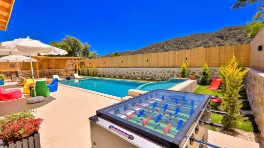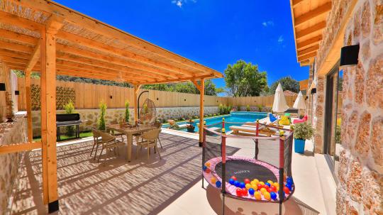 Villanın geniş havuz terasında; yemyeşil bir bahçe alanı, çocuk havuzu, oyun alanı, bahçe salıncağı, yemek masası, barbekü ve langırt gibi eğlenceli aktivitelerle dolu keyifli bir yaşam alanı sizi bekliyor. Özellikle çocuklu aileler için ideal olan bu detaylar, hem dinlenmeyi hem de eğlenceyi bir arada sunar.