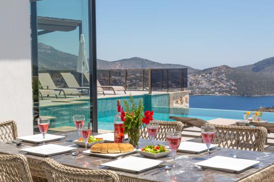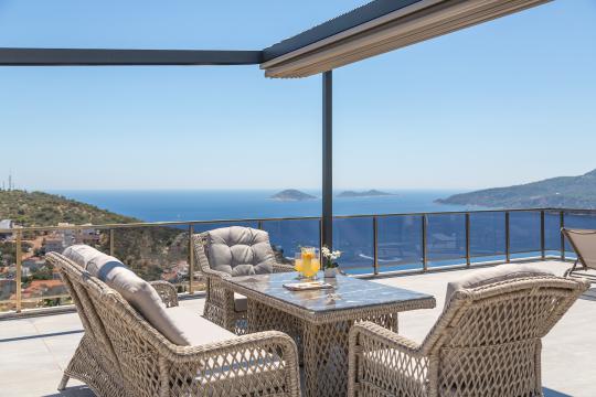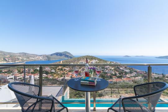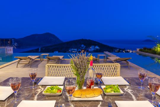 Kalkan’ın prestijli Kalamar Bölgesi’nde yer alan Villa Mirada 1, muhteşem Kalamar Körfezi manzarasıyla büyüleyen 5 yatak odalı, 10 kişilik lüks bir tatil villasıdır. Denize ve merkeze sadece 2 km mesafedeki bu villa, plaj, market, restoran, kafe ve alışveriş merkezlerine kolay ulaşım sağlar. Geniş bahçesinde 11x4 metre ölçülerinde, 165 cm derinliğinde özel bir sonsuzluk havuzu, içinde sığ havuz alanı ve jakuzi bulunur. Villanın tüm odalarından deniz manzarasının tadını çıkarabilir, manzaralı geniş yemek alanında Kalkan’ın ünlü gün batımı eşliğinde keyifli akşam yemekleri yiyebilirsiniz. Modern tasarımı ve sunduğu konforla Villa Mirada 1, kalabalık aileler ve arkadaş grupları için unutulmaz bir tatil deneyimi sunar.