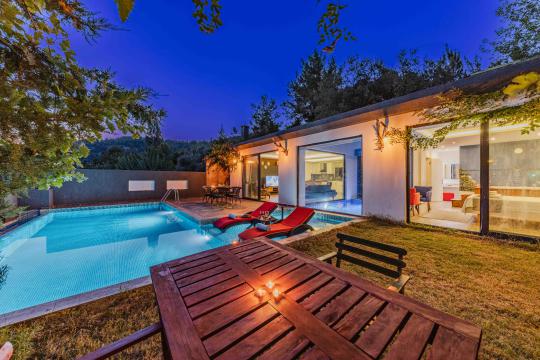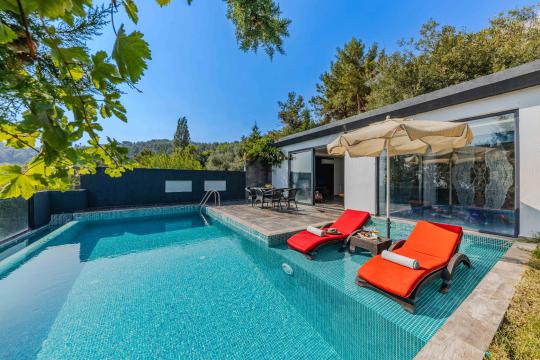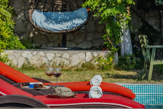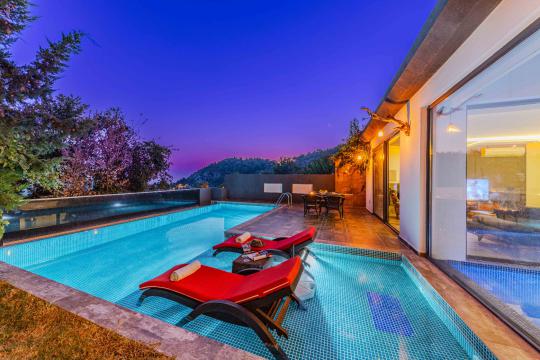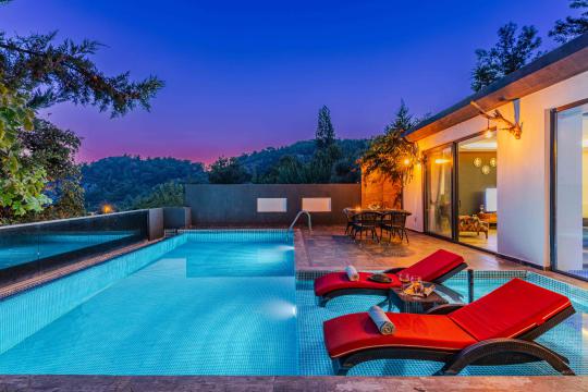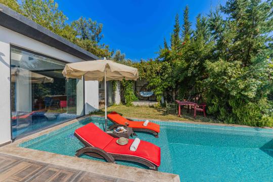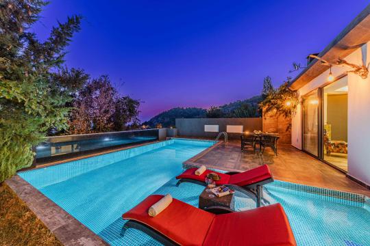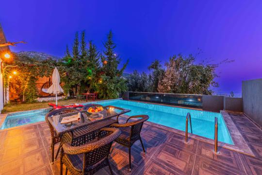 Doğayla iç içe huzurlu bir atmosferde, lüks ve mahremiyetin buluştuğu Villa Muzo 1, Kalkan’ın gözde İslamlar bölgesinde konumlanmış özel bir balayı villasıdır. Sadece 2 kişilik kapasitesiyle romantik kaçamaklar için tasarlanmış bu villa, yılın dört mevsimi konforlu bir tatil deneyimi sunar. Korunaklı havuz alanı ile dışarıdan görünmeyen özel bir alan sağlayan Villa Muzo 1, özellikle muhafazakar çiftler için ideal bir seçenektir. Villamızın havuz terasında yeşil bahçe alanı ve bahçe salıncağı da bulunmaktadır. Villamızda yer alan kapalı ve ısıtmalı havuz, soğuk havalarda bile keyifli vakit geçirmenizi mümkün kılar, bu özelliğiyle villa kış tatiline uygun seçenekler arasında öne çıkar.