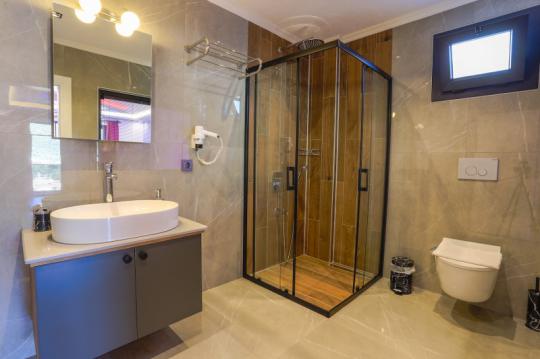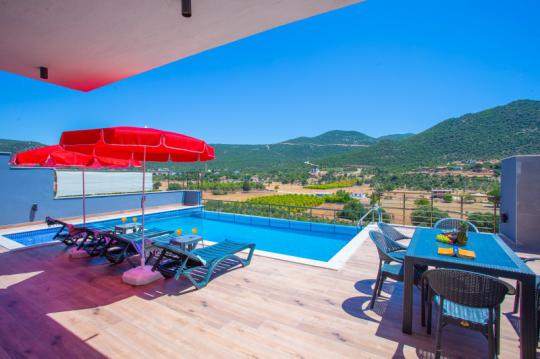 3 yatak odası ile 6 kişilik konaklama kapasitesine sahip olan villamızın yemyeşil doğa manzarasına açılan, geniş havuz terasında bahçe salıncağı, barbekü, oturma grubu, yemek masası ve küçük misafirlerimiz için çocuk havuzu yer almaktadır. İzole bir tatil geçirmek isteyen misafirlerimiz için ise talep edilmesi halinde havuz önü perde ile kapatılarak korunaklı hale gelmektedir. Sakin ve huzurlu atmosferi, şık dizaynı ve eşsiz manzarası ile kendine hayran bırakan villamızda keyif yapabileceğiniz çift kişilik jakuzi de bulunuyor. Villamız geniş aileler ve kalabalık arkadaş grupları için huzurlu bir tatil fırsatı sunmaktadır.