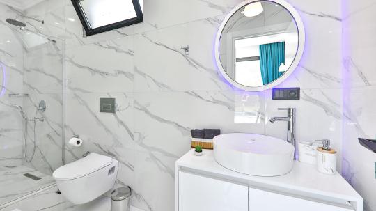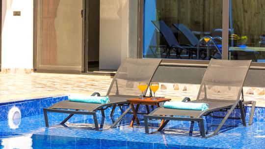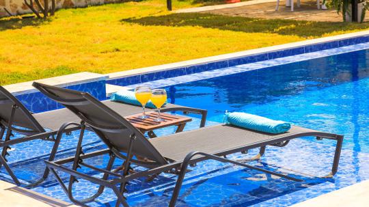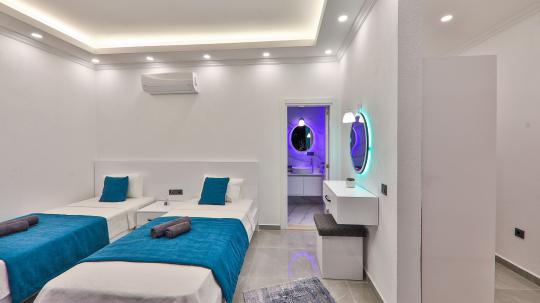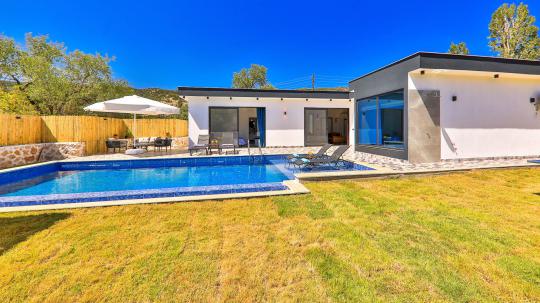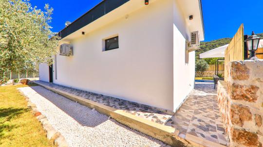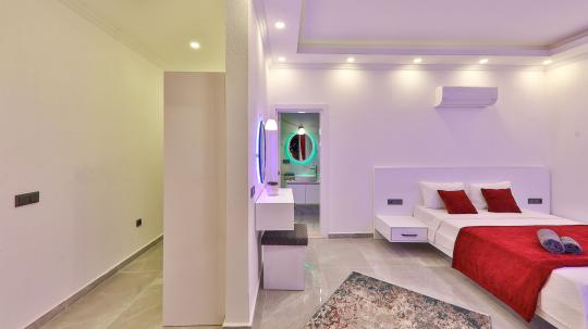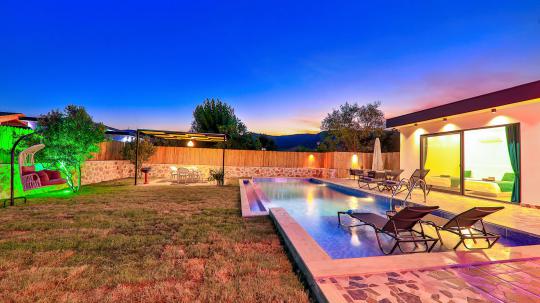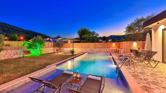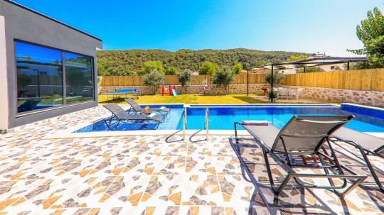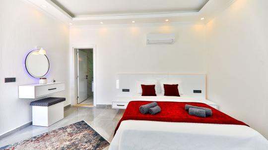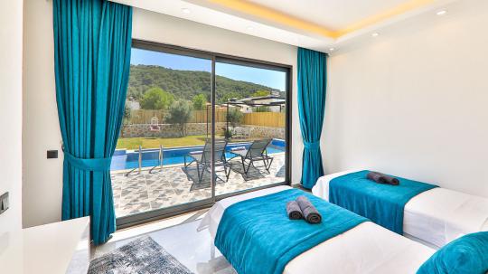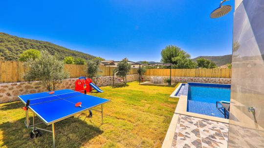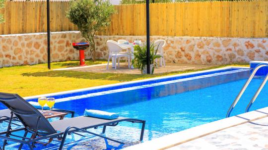 Villa Su Perisi, Kalkan’ın doğayla iç içe, huzur dolu atmosferiyle öne çıkan Sarıbelen bölgesinde yer alan, 2 yatak odalı ve 4 kişilik kapasiteye sahip özel bir tatil villasıdır. Özellikle aile tatilleri ve çocuklu misafirler için tasarlanmış olan bu villa, sunduğu olanaklarla unutulmaz bir konaklama deneyimi sunar. Villanın en dikkat çekici özelliklerinden biri, korunaklı havuz alanı sayesinde dışarıdan görünmeyen, gizliliğe önem veren misafirler için ideal bir ortam sunmasıdır. Doğa manzaralı bu villanın havuz terasında; geniş yeşil bahçe alanı, çocuk oyun alanı, bahçe salıncağı, açık hava yemek masası, barbekü ve langırt gibi eğlenceli detaylar yer alır. Hem dinlenmek hem de keyifli zaman geçirmek isteyen aileler için mükemmel bir seçenektir. Ana yatak odasında yer alan jakuzi, tatilinize ekstra konfor ve lüks katarken, doğa ile baş başa huzurlu bir atmosferde benzersiz bir tatil deneyimi sunar.